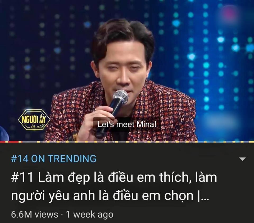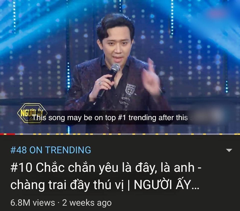 Cách đây vài giờ đồng hồ, Trấn Thành không thể kìm nén niềm vui sướng khi đăng tải khoảnh khắc bản thân “chễm trệ” xuất hiện trên 7 video đều lọt top thịnh trên YouTube cùng một thời điểm. Trong đó, 5 show giải trí đang nhận được sự quan tâm của đông đảo khán giả truyền hình như Giọng ải giọng ai, Người ấy là ai, Siêu tài năng nhí,…