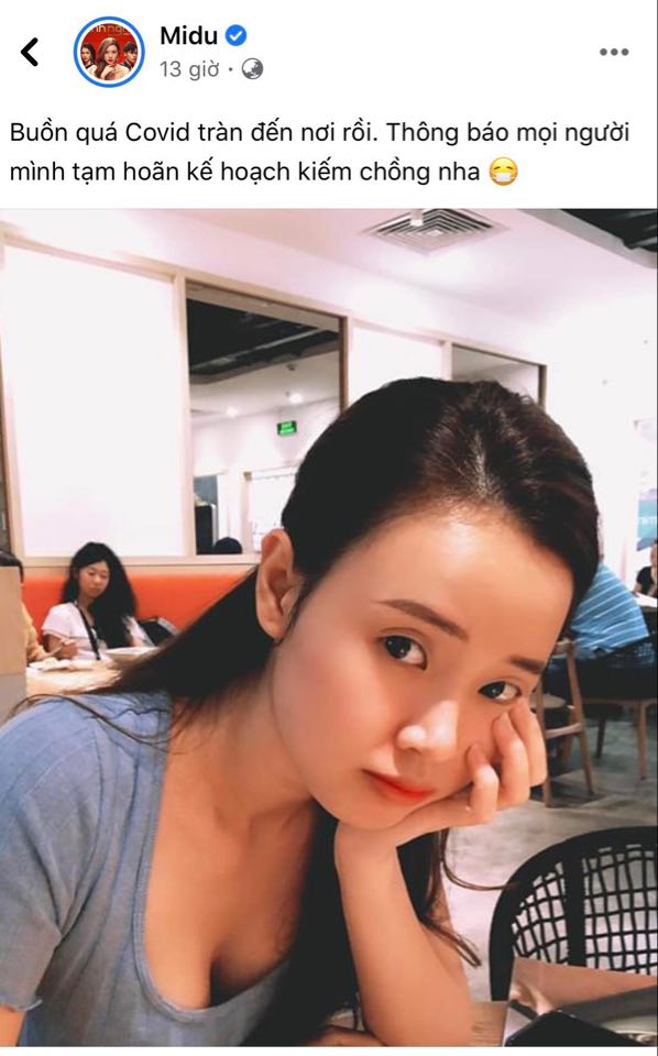 Đáng chú ý, cách đây vài giờ, trên fanpage chính thức, Midu bất ngờ thông báo kế hoạch hoãn… tìm chồng với lý do hết sức bất ngờ. Cụ thể, người đẹp vui vẻ chia sẻ: “Buồn quá Covid tràn đến nơi rồi. Thông báo mọi người mình tạm hoãn kế hoạch kiếm chồng nha!”.