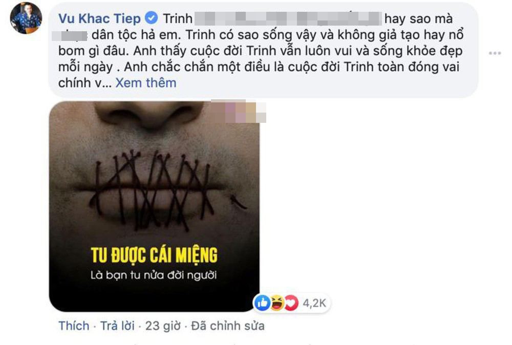 Ngay lập tức ông bầu đã vào hẳn bài đăng và để lại bình luận gay gắt: “Anh chắc chắn một điều là cuộc đời Trinh toàn đóng vai chính và chưa đóng vai phụ một giây rồi tung hô, tự hào về thành tích của mình. Trinh không đụng chạm đến ai bao giờ. Anh nghĩ em đang chửi nhiều người trong đó có rất nhiều sao thế giới đó em".