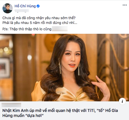 Cụ thể, chỉ sau vài tiếng phía Nhật Kim Anh và Titi lên phủ nhận mối quan hệ yêu đương và khẳng định chỉ là đồng nghiệp giúp đỡ nhau, cùng nhau hoạt động kinh doanh mỹ phẩm. Hồ Gia Hùng đã chia sẻ hẳn bài viết về Nhật Kim Anh với nội dung tiết lộ về mối quan hệ của Titi.