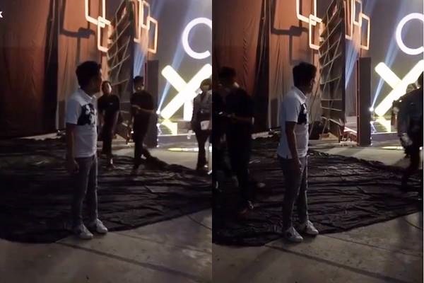 Ngay lúc đó, Trường Giang phát hiện có người ném chai lên sân khấu và lớn tiếng: “Ai quăng cái chai vậy? Bảo vệ đâu? Thôi đi vô, không diễn nữa, đi vô”. Nói xong ngay lập tức Trường Giang bỏ vào cánh gà khiến Lâm Vỹ Dạ cũng ngơ ngác.