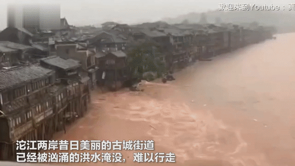 Vào ngày 30/6, hàng loạt clip Phượng Hoàng Cổ Trấn bị “nhấn chìm” trong biển nước lũ đục ngầu chảy qua các con phố, nước ngập đến vai, hàng chục người mắc kẹt. Ở những khu vực hiện đại hơn, phương tiện và người đi bộ cũng phải vật lộn để di chuyển qua xoáy nước.