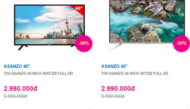 Cụ thể, nhiều TV từ thương hiệu nổi tiếng trong và ngoài nước như Asanzo, LG, Sony, TCL hay Samsung đều đồng loạt giảm tới 60%. Hiện tại, hầu hết các mặt hàng TV đều có giá tốt, phù hợp với túi tiền của đa số đại gia đình tại Việt Nam.