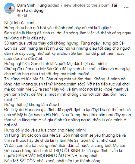 Cách đây ít giờ, Đàm Vĩnh Hưng bất ngờ đăng tải một bức “tâm thư” dài tâm sự về “người mẹ” của mình. Cụ thể, đó chính là TP.Hồ Chí Minh – nơi nam ca sĩ đang làm việc và sinh sống. Được biết, thành phố chuẩn bị thực hiện theo chỉ thị 16 giãn cách toàn thành phố, thời gian áp dụng 15 ngày vì dịch bệnh đang ngày càng phức tạp.