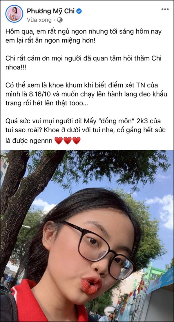 Những ngày gần đây, Phương Mỹ Chi gây chú ý khi tiết lộ điểm thi tốt nghiệp THPT Quốc Gia 2021. Nữ ca sĩ không giấu được niềm hạnh phúc khi đạt được kết quả cao sau 12 năm đèn sách đầy cố gắng. Cụ thể, cô hớn hở khoe với dân tình được 8.6/10 điểm xét tốt nghiệp.