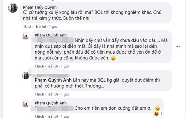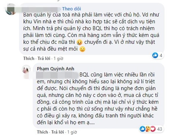 Dưới bài viết, nhiều bình luận đồng cảm với Phạm Quỳnh Anh, nhiều người khuyên nữ ca sĩ nên dọn đi nơi khác sống vì ‘hàng xóm không đáng mến’. Khán giả cũng cho rằng khi nuôi nhiều động vật như vậy mà không giữ vệ sinh chung để ảnh hưởng người khác, hàng xóm của Phạm Quỳnh Anh ý thức quá kém.
