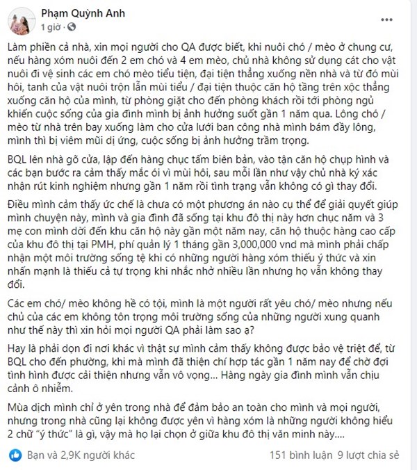 Dù là người yêu động vật, Phạm Quỳnh Anh vẫn không thể chịu được sự ô nhiễm. Nữ ca sĩ cho biết người dân ở khu căn hộ này không có ý thức vệ sinh vật nuôi, mùi hôi tạnh của vật nuôi lần mùi nước tiểu, phân đã xộc thẳng vào căn hộ của cô, khiến cho khắp nhà bị ám mùi ô nhiễm nghiêm trọng.