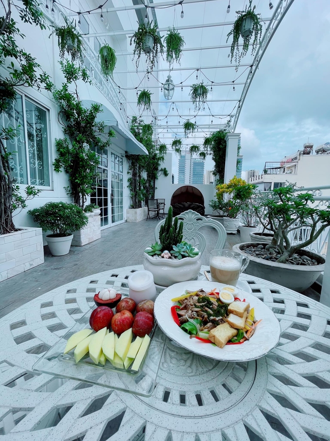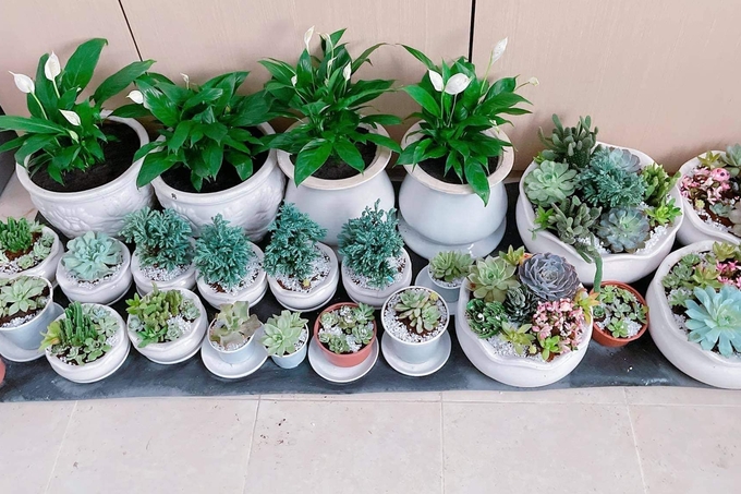 Bên ngoài ban công được cựu Đại sứ Du lịch đầu tư trồng nhiều cây xanh, mang đến mảng xanh cho không gian sống. Đây cũng là khu vực cô rất yêu thích trong ngôi nhà vừa ngắm cây cối vừa thưởng trà và những món ngon bổ dưỡng. Hàng ngày, cô dành nhiều thời gian chăm sóc cây cối, trong đó có nhiều chậu sen đá.