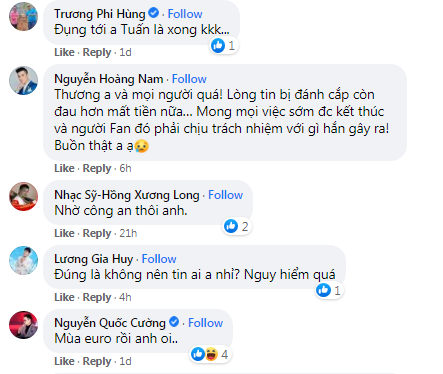 Được biết, số tiền mà người này lừa đảo đã lên tới hơn 700 triệu đồng. Ngay lập tức, rất nhiều sao Việt và người hâm mộ đã để lại rất nhiều bình luận bàng hoàng và tức giận: “Ghét nhất lợi dụng lòng tốt đi lừa đảo." "Em cũng hay bị", Thương anh và mọi người quá! Lòng tin bị đánh cắp còn đau hơn mất tiền nữa… Mong mọi việc sớm có kết thúc và người fan đó phải chịu trách nhiệm với gì hắn gây ra!", "Vì đồng tiền mà đánh đổi nhân cách. Bó tay luôn".