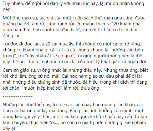 “Những lúc như thế này, trí tuệ cao siêu hay hào quang sân khấu, các ông các bà xin giữ lấy mà dùng. Bằng sức ảnh hưởng của mình, một dòng kêu gọi về ý thức, một câu kêu gọi về khử khuẩn hay đeo cấm tụ tập tám chuyện…, nó còn có giá trị hơn những gì siêu phàm đấy ạ!”.