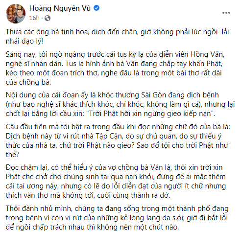 Mới đây, nhà báo Hoàng Nguyên Vũ cũng đã đăng đàn chỉ trích thậm tệ nghệ sĩ Hồng Vân bằng một bài viết dài trên Facebook á nhan. Anh nói: “Thưa các ông bà tinh hoa, dịch đến chân, giờ không phải lúc ngồi lải nhải đạo lý!