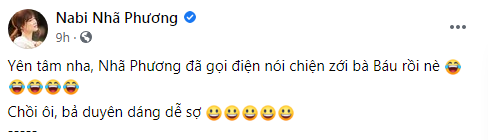 Với giọng điệu dồn dập và mang đầy vẻ nghiêm trọng vừa tố vừa mắng, cuộc gọi này khiến khán giả không thể nhịn được cười. Nhã Phương cũng chia sẻ lại video vui nhộn này trên trang cá nhân và đáp rằng: "Yên tâm nha, Nhã Phương đã gọi điện nói chuyện với bà Báu rồi nè! Trời ơi, bả duyên dáng dễ sợ!"