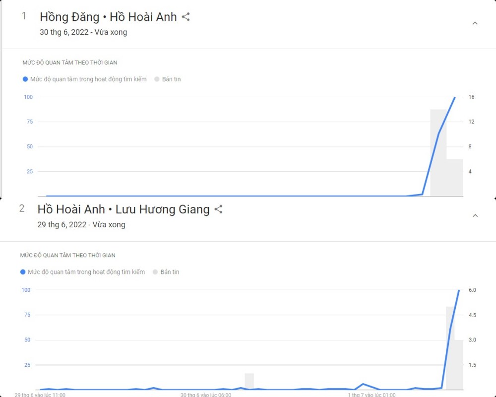 Riêng tên “Hồng Đăng” có hơn 50.000 lượt tìm kiếm chỉ trong 1 giờ đồng hồ. Việc tên của 2 nghệ sĩ này nhảy vọt về số lượng tìm kiếm trên Google tại Việt Nam khiến nhiều người không khỏi bất ngờ bởi cả hai đều khá kín tiếng về đời tư.