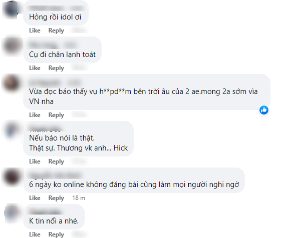 Đến nay, dù vẫn chưa được nêu tên, nhưng MXH đang bàn tán xôn xao và bày tỏ nghi vấn với 2 nghệ sĩ là Hồng Đăng và Hồ Hoài Anh. Ngay lập tức, CĐM đã tràn vào Facebook của cả hai và để lại những bình luận hỏi thăm, bày tỏ sự hoang mang và không tin vào những thông tin thất thiệt.