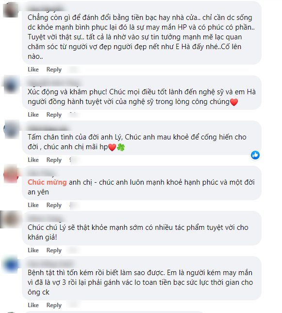 “Chẳng còn gì để đánh đổi bằng tiền bạc hay nhà cửa.. chỉ cần dc sống dc khỏe mạnh bình phục lại đó là sự may mắn HP và có phúc có phần.. Tuyệt vời thật sự.. tất cả là nhờ vào sự tin tưởng mạnh mẽ lạc quan chăm sóc từ người vợ đẹp người đẹp nết như E Hà đấy nhé..Cố lên nào…”