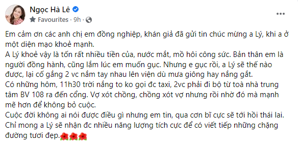 "Em cảm ơn các anh chị em đồng nghiệp, khán giả đã gửi tin chúc mừng anh Lý, khi a ở một diện mạo khoẻ mạnh.