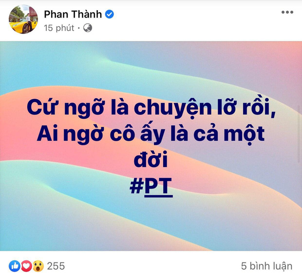 Đây không phải lần đầu tiên Phan Thành bị nghi ngờ ẩn ý nhắc đến Midu. Trước đó, anh thường xuyên đăng tải những dòng trạng thái cảm xúc như: “Cả một trời thương nhớ”, “Làm gì cũng phải suy nghĩ cho thật kĩ, để sau này sẽ không phải hối hận với lựa chọn của mình"...