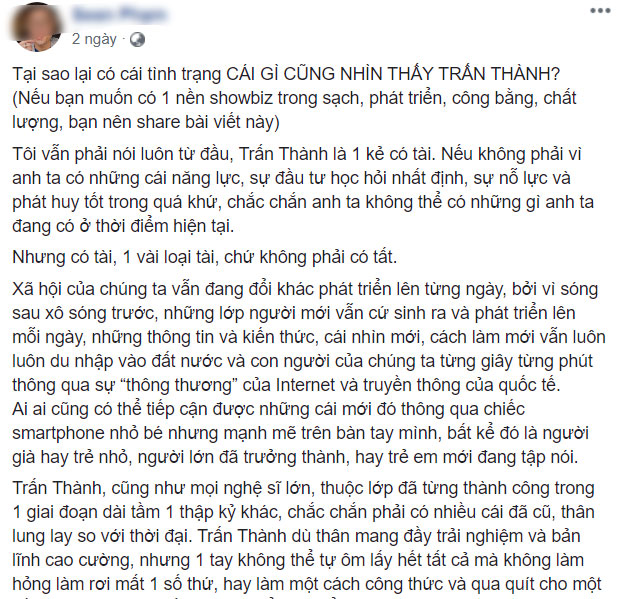 Theo đó, một tài khoản MXH có tên S.P đã công khai đăng đàn chửi bới Trấn Thành, cho rằng không nên xem những chương trình có Trấn Thành, cần để dành đất cho thế hệ trẻ. Người này còn nhấn mạnh rằng Trấn Thành chỉ là một kẻ pha trò nhạt nhẽo với lối dẫn nhàm, quá công thức. Thậm chí còn đoán trước được Trấn Thành sẽ nói gì, trịch thượng vô cùng khi đặt mình lên trên tất cả những khách mời, người chơi, khán giả tham gia chương trình.