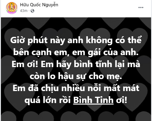 NSƯT Hữu Quốc đau buồn chia sẻ: “Giờ phút này anh không có thể bên cạnh em, em gái của anh. Em ơi! Em hãy bình tĩnh lại mà còn lo hậu sự cho mẹ. Em đã chịu nhiều nỗi mất mát quá lớn rồi Bình Tinh ơi!”. Nam nghệ sĩ còn dặn dò người thân của Bình Tinh hãy lo lắng và động viên đàn em.