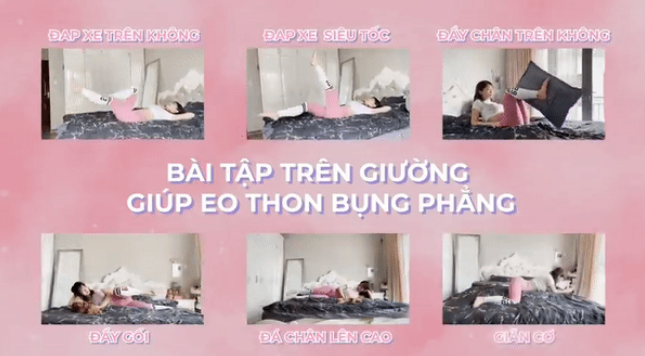 Qua đó, clip 20 phút chính là tổng hợp 6 bài tập giúp eo thon, bụng phẳng như đạp xe trên không, đạp xe siêu tốc, đẩy chân trân không, đẩy gối, đá chân lên cao, giãn cơ. Tất cả đều được thực hiện…trên giường.