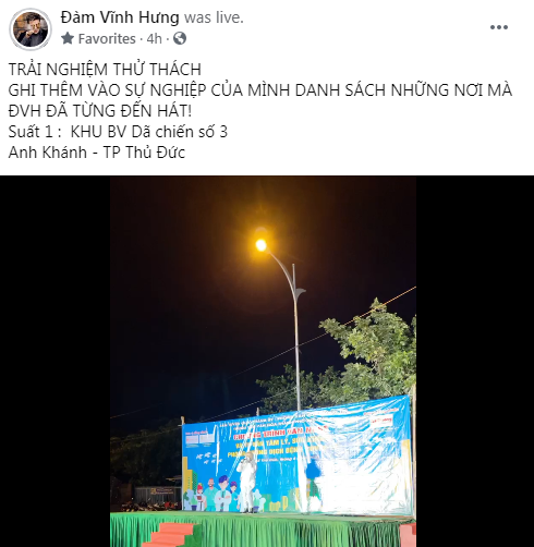 Cách đây ít giờ, NSND Hồng Vân bất ngờ chia sẻ livestream của Đàm Vĩnh Hưng. Cụ thể, ngày hôm nay (10/8), Mr. Đàm đã tới khu bệnh viện Dã chiến số 3 tại TP.Thủ Đức để giao lưu văn nghệ, hát những ca khúc động viên các bệnh nhân đang điều trị tại đây.