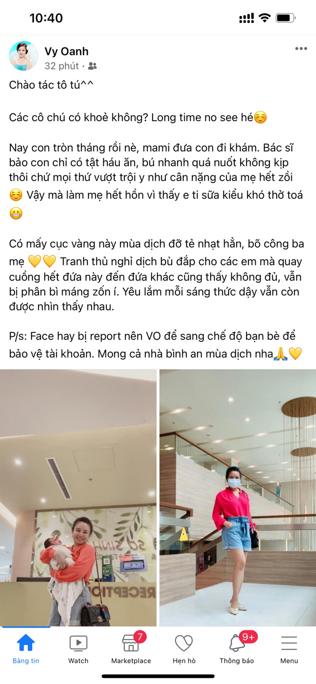 Sáng ngày hôm nay (13/8), sau 1 tháng “im hơi lặng tiếng” để chăm lo cho con nhỏ, Vy Oanh đã chính thức tái xuất mạng xã hội. Giọng ca “Đồng xanh” vui vẻ chia sẻ trên trang cá nhân: