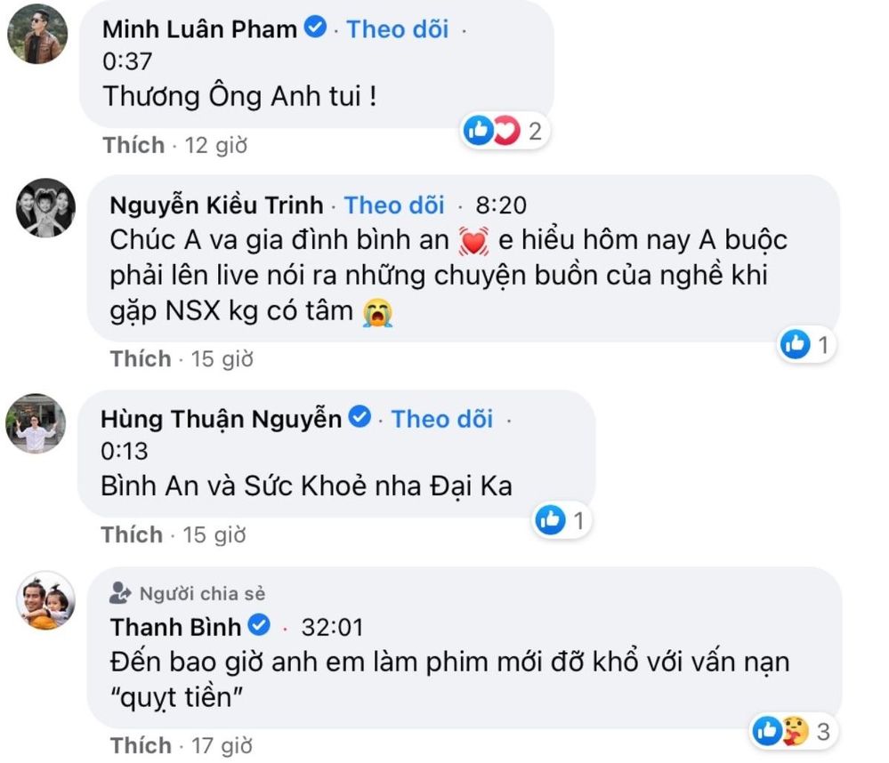 Đoạn livestream trên của vị đạo diễn nổi tiếng nhận được sự quan tâm của đông đảo NS Việt, nhất là các diễn viên. Nhiều tên tuổi có tiếng như Minh Luân, Thanh Bình, Kiều Trinh, Hùng Thuận,.. đã bày tỏ sự đồng cảm, bức xúc trước hành động của NSX và liên tục lên tiếng đòi lại công bằng cho vị đạo diễn cùng những thành viên khác trong đoàn.