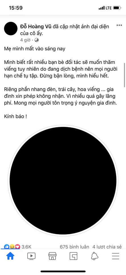 Cách đây ít phút, Hari Won bất ngờ thay đổi ảnh đại diện trang cá nhân thành màu đen với lời thông báo khiến CĐM bàng hoàng: “Giờ bác đã đi rồi, mỗi lần qua nhà là bác lo đồ ăn cho mình. Lúc nào cũng là người ủng hộ và khán giả yêu quý của mình. Đến thời điểm này vẫn ko tin dc là bác đi như vậy.