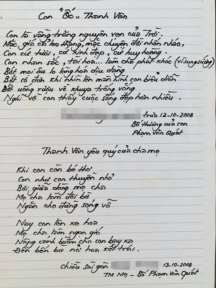 Ốc Thanh Vân không khỏi bồi hồi bởi những dòng thơ chất chứa tình cảm của phụ huynh. Được viết từ tháng 10/2008, đây là những lời nhắn cuối gửi đến cô con gái nhỏ: “Con là vầng trăng nguyên vẹn của trời. Mặc giá cả leo thang, mặc chuyện thời nhốn nháo. Con cứ tươi, cứ xinh đẹp, cứ huy hoàng. Nghĩ về con thấy cuộc sống đẹp hơn nhiều. Bố thương của con.