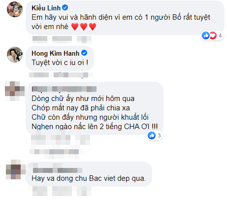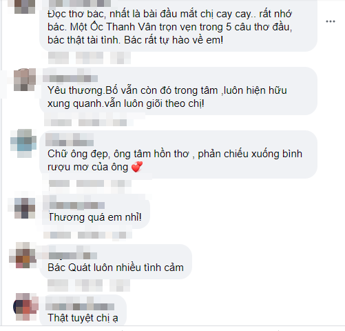 Nhiều khán giả sau khi nhìn thấy những dòng chia sẻ của Ốc Thanh Vân đã không kiềm được xúc động: "Chữ ông đẹp, ông tâm hồn thơ", "Ông ngoại nét chữ đẹp thơ hay, cảm động quá chị ạ!", "Em đọc mà rớt nước mắt luôn chị", "Cảm động biết bao tình cảm, tình yêu thương của người bố dành cho con qua những câu thơ",...