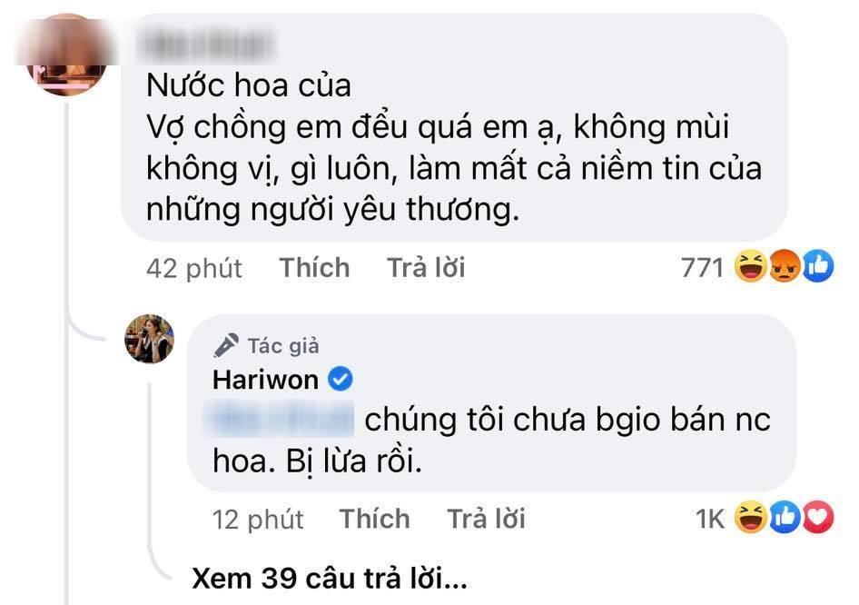 Dưới phần bình luận, lập tức một tài khoản tố vợ chồng Trấn Thành bán nước hoa giả. Nguyên văn như sau: “Nước hoa của vợ chồng em đểu quá em ạ, không mùi không vị gì luôn, làm mất cả niềm tin của những người yêu thương". Ngay lập tức, Hari Won đã lên tiếng đáp trả, khẳng định: "Chúng tôi chưa bao giờ bán nước hoa. Bị lừa rồi".