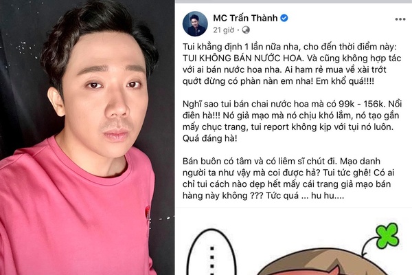 Nam MC bức xúc viết trên trang cá nhân: “Tôi khẳng định một lần nữa, cho đến thời điểm này tôi không bán nước hoa. Và cũng không hợp tác với ai bán nước hoa nha. Ai ham rẻ mua về trớt quớt đừng có phàn nàn tôi nha. Tôi khổ quá. Nghĩ sao tôi bán chai nước hoa mà có 99.000 - 156.000 đồng, nổi điên hà. Nó giả mạo mà nó chịu khó lắm, nó tạo gần mấy chục trang, tôi báo cáo không kịp với nó luôn, quá đáng hà".