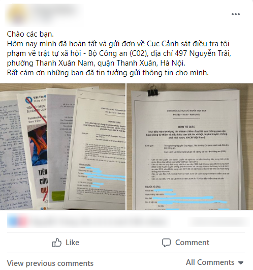 Hôm nay mình đã hoàn tất và gửi đơn về Cục Cảnh sát điều tra tội phạm về trật tự xã hội - Bộ Công an (C02), địa chỉ tại Nguyễn Trãi, phường Thanh Xuân Nam, quận Thanh Xuân, Hà Nội.