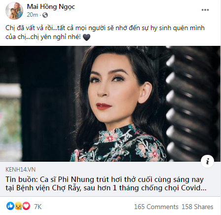 Những ngày qua có biết bao nhiêu lời cầu nguyện của Đồng nghiệp và khán giả cho Nhung… các Bác Sĩ BV Chợ Rẫy cũng đã cố gắng hết sức,Ngay cả Nhung cũng vậy,kiên cường đến phút cuối cùng… Vậy mà cũng không thể vượt qua số phận… cảm thấy tiếc,thương,và đau lòng quá.