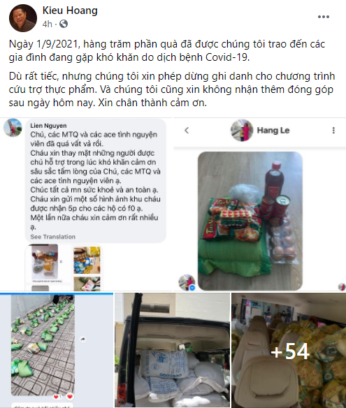 Qua đó, Hoàng Kiều cũng tiếp tục đưa ra thông báo dừng cứu trợ Sài Gòn sau ngày 2/9. “Ngày 1/9/2021, hàng trăm phần quà đã được chúng tôi trao đến các gia đình đang gặp khó khăn do dịch bệnh Covid-19. Dù rất tiếc, nhưng chúng tôi xin phép dừng ghi danh cho chương trình cứu trợ thực phẩm. Và chúng tôi cũng xin không nhận thêm đóng góp sau ngày hôm nay. Xin chân thành cảm ơn”.