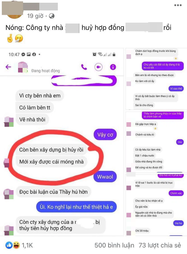 Theo đó, vào ngày hôm qua (22/9), một tài khoản đã đăng tải đoạn tin nhắn được cho là cuộc trao đổi giữa bên thiết kế nhà và một người khác. Đáng chú ý, cuộc đối thoại có nhắc tới Thủy Tiên và cho biết cô đã chấm dứt hợp đồng với công ty xây dựng trước khi dịch bùng phát.