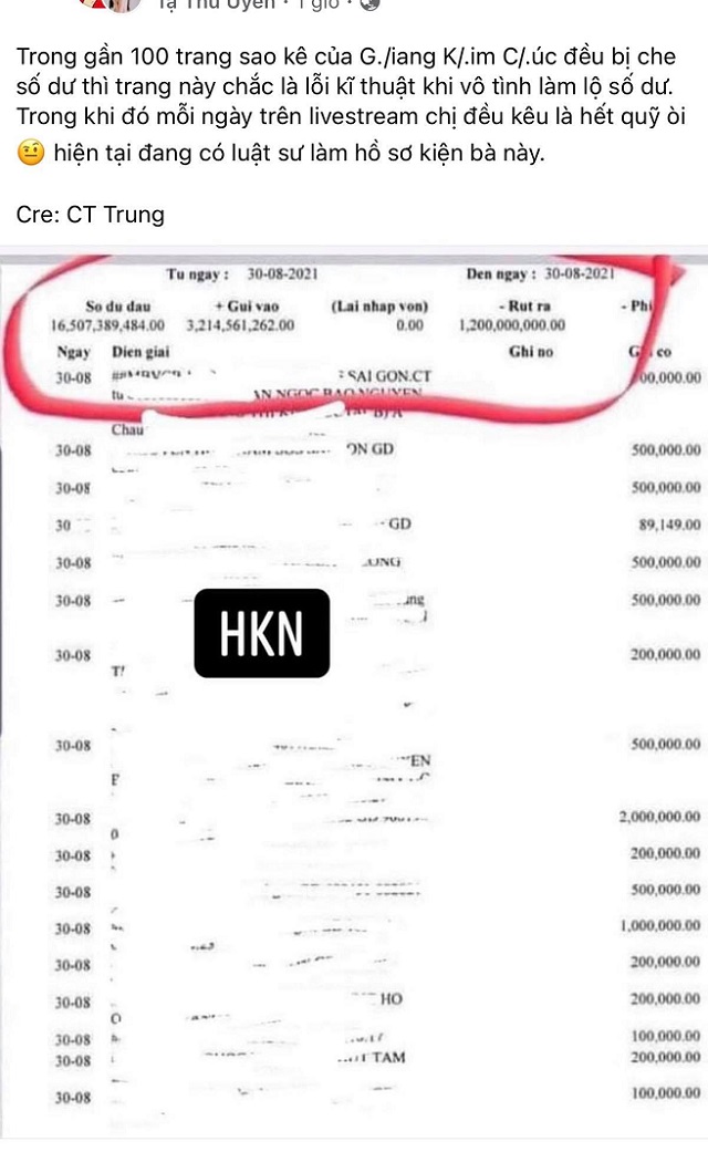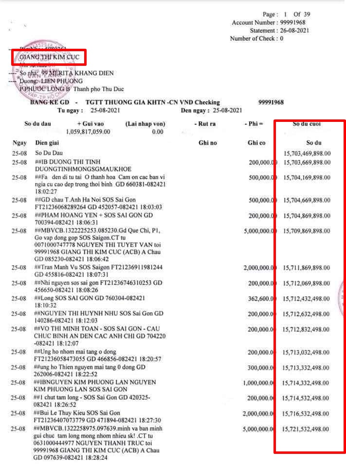 Vào chiều 11/9, công chúng ngỡ ngàng khi một số bản sao kê được cho là của Giang Kim Cúc, trưởng nhóm Mai tang 0 đồng, trợ tang cho người dân qua đời vì Covid-19 lộ ra ngoài. Theo đó, tài khoản có ghi lại vào ngày 30/8 xấp xỉ 20 tỷ đồng.