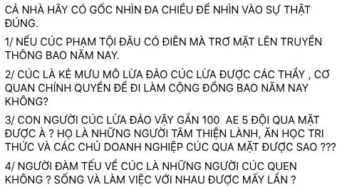Cô cũng tuyên bố, nếu ai vẫn còn tin nhóm thì cứ gửi tiền. Nếu không, các nhà hảo tâm đã chuyển khoản mà muốn "đòi" lại, "cứ cho Cúc ủy nhiệm chi, Cúc lập tức chuyển trả".