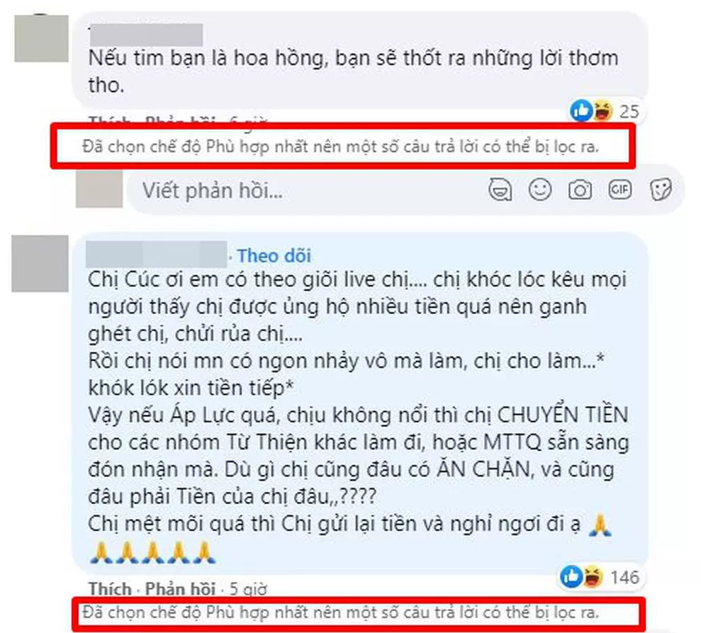 Nhưng theo đó, trên page và trang cá nhân, Giang Kim Cúc lại “thẳng tay”, xóa rất nhanh những bình luận trái chiều, chỉ trích cô nói dối, kê khai sai sự thật số tiền quyên góp của mạnh thường quân. Việc Giang Kim Cúc bị Sở thông tin truyền thông phạt 10 triệu đồng vì bịa đặt chuyện bà ngoại rút máy thở bé sinh non cũng bị dân mạng đem ra chỉ trích. Cả trang cá nhân và page đều được đặt chế độ kiểm duyệt, lọc bình luận để chỉ giữ lại những bình luận được chọn.