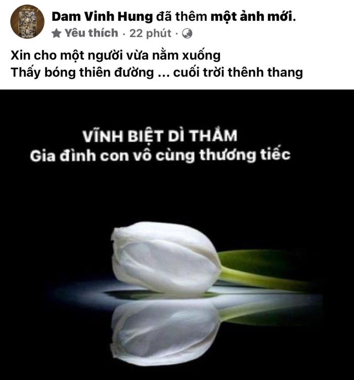 Mới đây nhất, sáng ngày 19/9, Đàm Vĩnh Hưng bất ngờ báo tin buồn khiến mọi người không khỏi xót xa. Trên trang cá nhân, “Ông hoàng nhạc Việt” cập nhật hình ảnh báo tang và đau đớn cho biết: “Xin cho một người vừa nằm xuống. Thấy bóng thiên đường… cuối trời thênh thang”. Trong bức ảnh đính kèm, nam ca sĩ còn nghẹn ngào gửi lời vĩnh biệt tới dì: “Vĩnh biệt dì Thắm. Gia đình con vô cùng thương tiếc”.