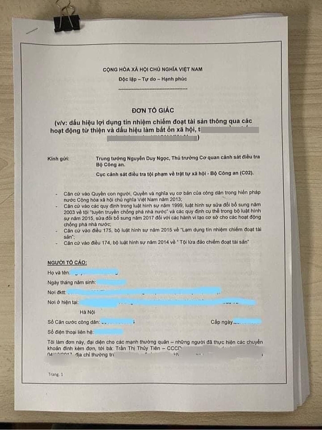 Được biết, cách đây không lâu, từng có thông tin Thủy Tiên nằm trong số nghệ sĩ bị tố giác có dấu hiệu lợi dụng tín nhiệm chiếm đoạt tài sản thông qua các hoạt động từ thiện. Tờ đơn tố giác thậm chí còn được đề người nhận là Thủ trưởng Cơ quan cảnh sát điều tra Bộ Công an.