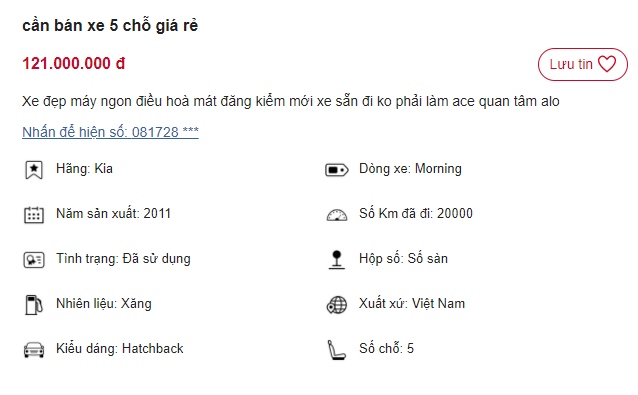 Cách đây không lâu, một người đã đăng tải thông tin bán xe lên trang Chotot.com và nhận được sự quan tâm từ đông đảo người tiêu dùng. Theo chủ bài viết, đây là mẫu xe hatchback Kia Morning màu xanh dương được đăng ký vào năm 2011. Từ những hình ảnh chủ xe cung cấp có thể thấy ngoại hình của xe vẫn còn khá đẹp, tuy nhiên bên trong khoang cabin đã cũ và không thể tránh được các vệt trầy xước.