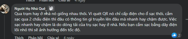 Lý giải về vấn đề này, có người lại cho rằng việc sạc nhanh hay chậm phụ thuộc vào dòng tải điện tại trạm và tại nhà vì bộ sạc vẫn do người dùng mang đến. Tuy nhiên, không thể phủ nhận, dòng diện ở các trạm sạc của VinFast ổn định hơn dòng điện tại hộ cá thể.