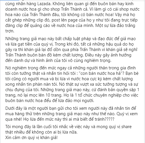 Tôi đã viết rất nhiều lần về điều này lên trang Page này. Vợ tôi cũng kêu ca bao nhiêu lần trên trang của cô ấy về việc này. Vậy mà vẫn có rất nhiều khán giả bị lừa mua nhầm nước hoa giả và kém chất lượng từ nhóm tổ chức này. Họ liên tục lập ra những page giả mạo với tiêu đề là shop nước hoa của Trấn Thành, cắt ghép hình ảnh của tôi đem vào đó sử dụng để lừa gạt mọi người….”