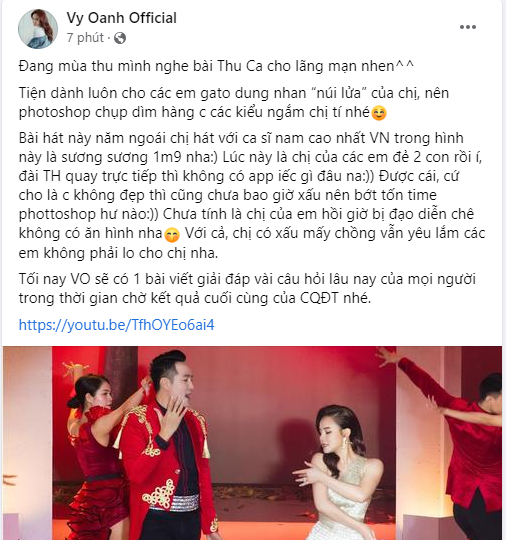 Trên trang cá nhân, Vy Oanh cho biết: "Được cái, cứ cho là chị không đẹp thì cũng chưa bao giờ xấu nên bớt tốn thời gian photoshop như nào. Chưa tính là chị của em hồi giờ bị đạo diễn chê không có ăn hình nha. Với cả, chị có xấu mấy chồng vẫn yêu lắm các em không phải lo cho chị nha".