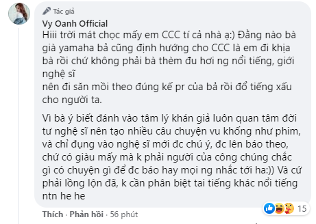 Ngoài ra dưới phần bình luận, Vy Oanh cũng không quên “đá xéo” nữ CEO. “Hiii trời mát chọc mấy em CCC tí cả nhà ạ:) Đằng nào bà già yamaha bả cũng định hướng cho CCC là em đi khịa bà rồi chứ không phải bà thèm đu hơi ng nổi tiếng, giới nghệ sĩ nên đi săn mồi theo đúng kế pr của bả rồi đổ tiếng xấu cho người ta.