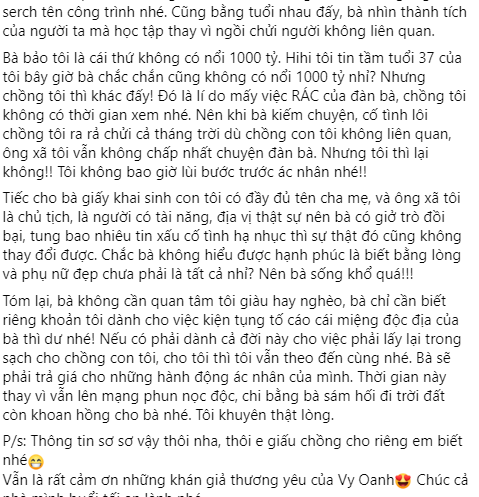 Nữ ca sĩ cho rằng việc bà Hằng vu khống cô như vậy là do trước giờ chưa từng chia sẻ về chồng trên MHX. Vy Oanh giải thích cặn kẽ về công việc cũng như tính cách của chồng mình dưới bài đăng. Giọng ca Đồng xanh cho biết ông xã là một người không thích phô trương và luôn luôn khiêm nhường. Cả hai vợ chồng cô không thích khoe mẽ tiền nong lên mạng xã hội vì biết sẽ còn có những người giỏi hơn mình.
