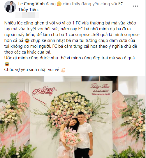 Tối muộn ngày 25/11, trên trang cá nhân của mình Công Vinh gây chú ý trong ngày đặc biệt của Thủy Tiên. Theo đó, cựu cầu thủ đã chia sẻ vô cùng tình cảm và đáng yêu khi cùng FC của Thủy Tiên chuẩn bị một sinh nhật bất ngờ cho nữ ca sĩ.