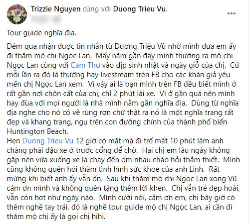 Mới đây, Trizzie Phương Trinh đã chia sẻ về việc gặp gỡ đàn em Dương Triệu Vũ bên đất khách. Tại đây, hai chị em đã cùng nhau ra thăm mộ NS Ngọc Lan. Cô cũng cho biết việc bản thân mình thường xuyên ra thăm viếng mộ NS Ngọc Lan vì nơi đây khá gần với nhà của mình.