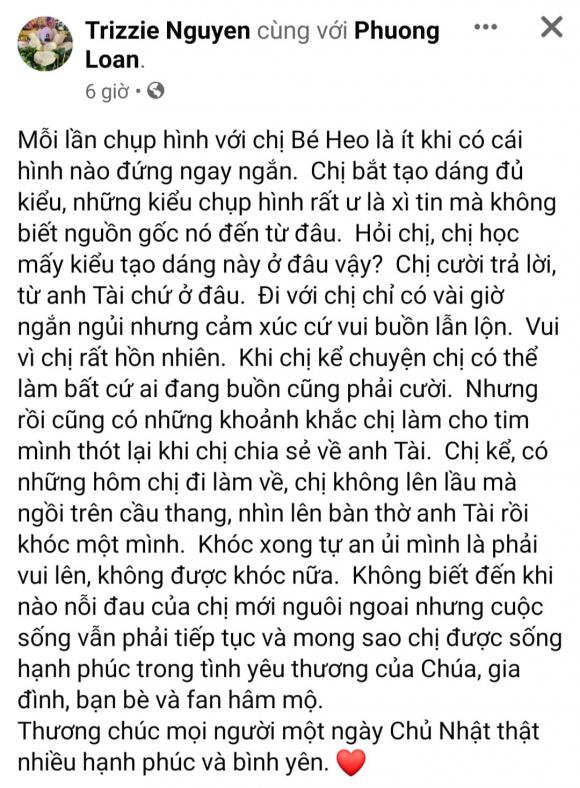 Những dòng chia sẻ của vợ cũ Bằng Kiều khiến không ít khán giả xót xa cho Phương Loan. Biết rằng cuộc sống của con người không thể đoán trước được điều gì nhưng tình cảm của Phương Loan dành cho cố ca sĩ Chí Tài thật khiến cho nhiều người ngưỡng mộ.